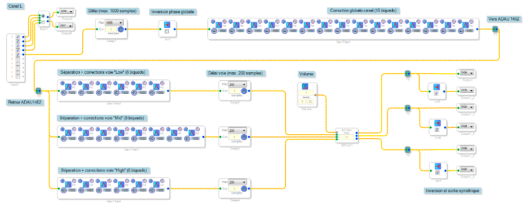 - Chaque DSPiy traitera un canal et les ressources du ADAU1701 seront exploitées comme dans l'application "1x3 pour enceinte 3 voies en IIR"