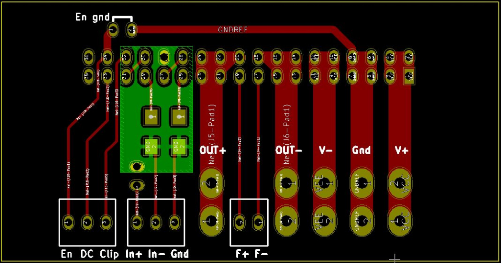 Pour le blindage/isolation entre les piste avec plan de masse gnd : j'ai envie de distinguer électriquement le "input Gnd" du pin 28 et le "power supply ground" des pins 5/6/7/8, de façon a garder un micro plan de masse pour le premier mais à faire un plan de masse intégral avec le second, qui ferait office de blindage entre les pistes sensibles comme celles que tu as pointées. Deux plans séparés quoi, sachant qu'ils sont connectés de toutes façons sur la carte ampli elle même, comme tu me l'avais précisé.