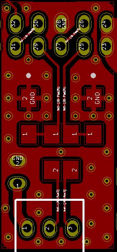 Pour éviter de faire circuler la piste du pin 32 (DC detect) entre les pin qui véhiculent du signal je lui ai fait faire un détour. Du coup le plan de masse est coupé pour la pin 34, mais j'ai supposé que pour une fonction logique sans impact sur le signal c'était pas grave de faire un détour... sinon je peux lui faire traverser directement le connecteur, elle va circuler contre la pin qui correspond à in unbuffered.