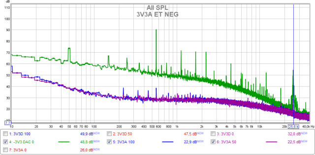 Et difficile de dire si au final le bruit sur 3V3 apparait en sortie de DAC ou si c'est le DAC qui crée du bruit sur le 3V3.