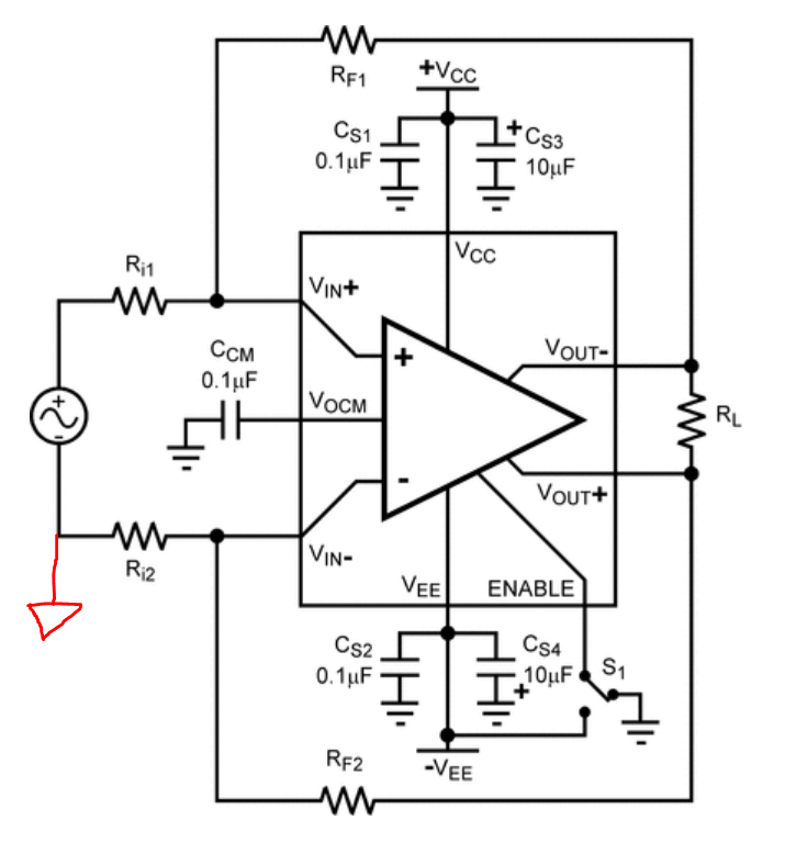 L'entrée étant aussi différentielle, on mettra simplement un GND sur Ri2. GND qui pourra être pris non pas au plus proche de l'AOP mais au DAC.