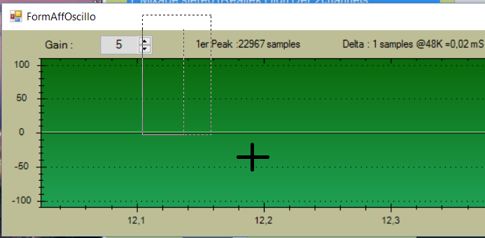 - je ne comprend pas "1er peak 1424 samples". Sur ce qui est visible, le premier pic visible est plus proche. Ou alors c'est le vocabulaire qui m'échappe. Comme l'axe des x est le temps en ms, je verrai bien affiché pic1: xxxx sp (xx ms) pic2 : yyyy sp (yy ms) délai : 1424 sp (29.6ms).
