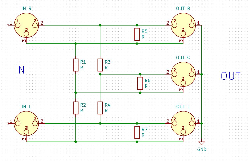 Dan ce cas tu oublie tes XLR OUT_R et OUT_L, la sommation pour C se fait deux sorties indépendamment des autres qui ne servent que pour L et R.
