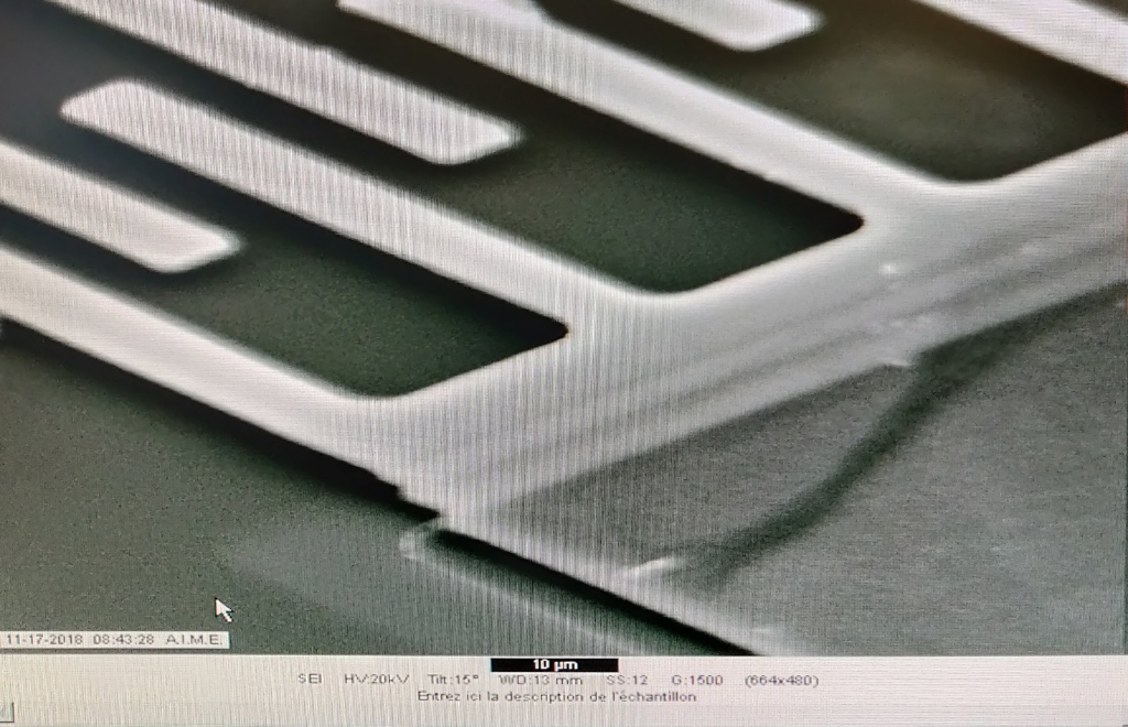 Une vue au microscope optique du wafer après le premier masque, qui sert au maintient des structures mécaniques.