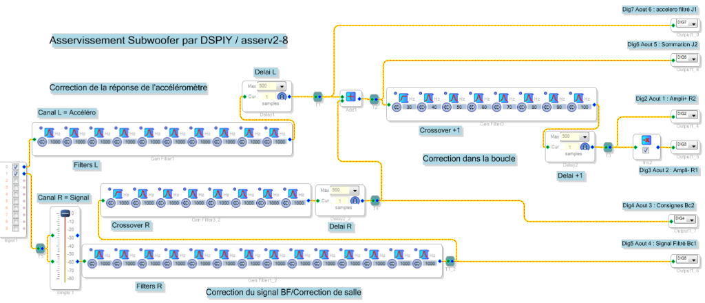 On aura donc à disposition la batterie de filtres du canal droit,puis le crossover du canal droit. On re-route le signal de la sortie du crossover vers le sommateur, (on a ici le signal de consigne). Ce signal est comparé au signal de l'accéléro dans le sommateur, et on sort le signal d'erreur vers le crossover "+1". (suivre le fil vert).