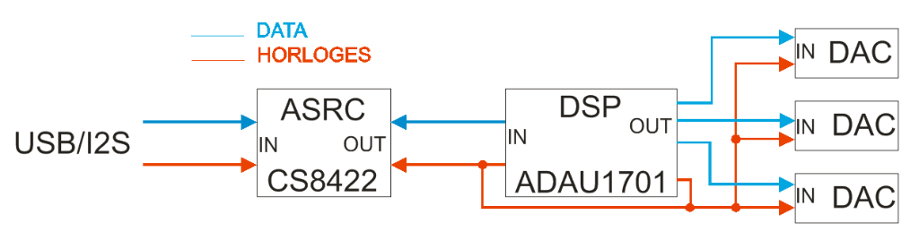 Après, c’est plus simple, le DSP envoi en tant que Maitre Out ses horloges aux 3 DACs et les datas via 3 bus I2S (dont les horloges sont communes) aux DAC via Sdata1, Sdata2 et Sdata3.