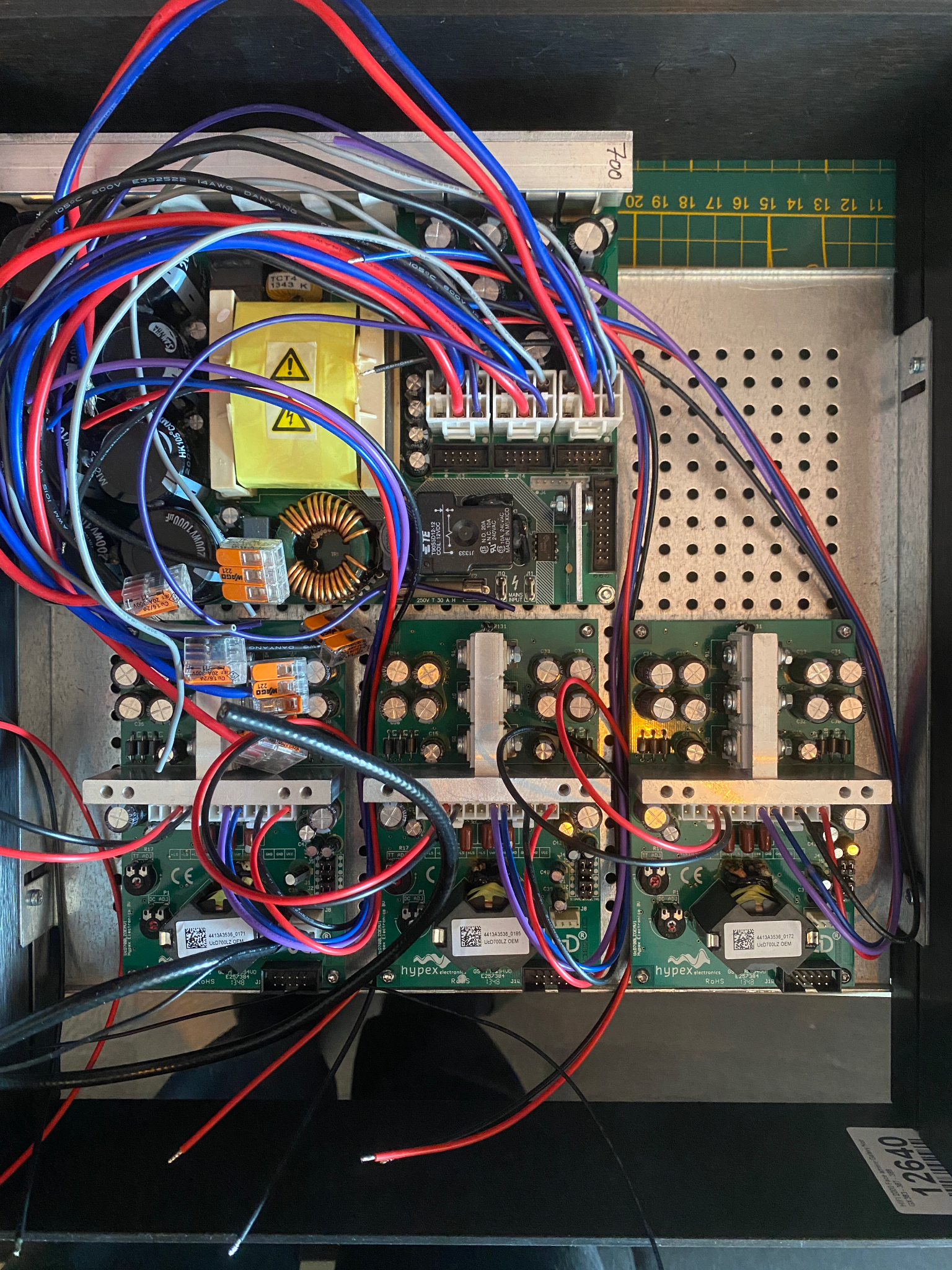 Plutôt étroit l’intégration. Tout est doublé hormis l’alim des cartes de protection HP et carte relais de trigger.