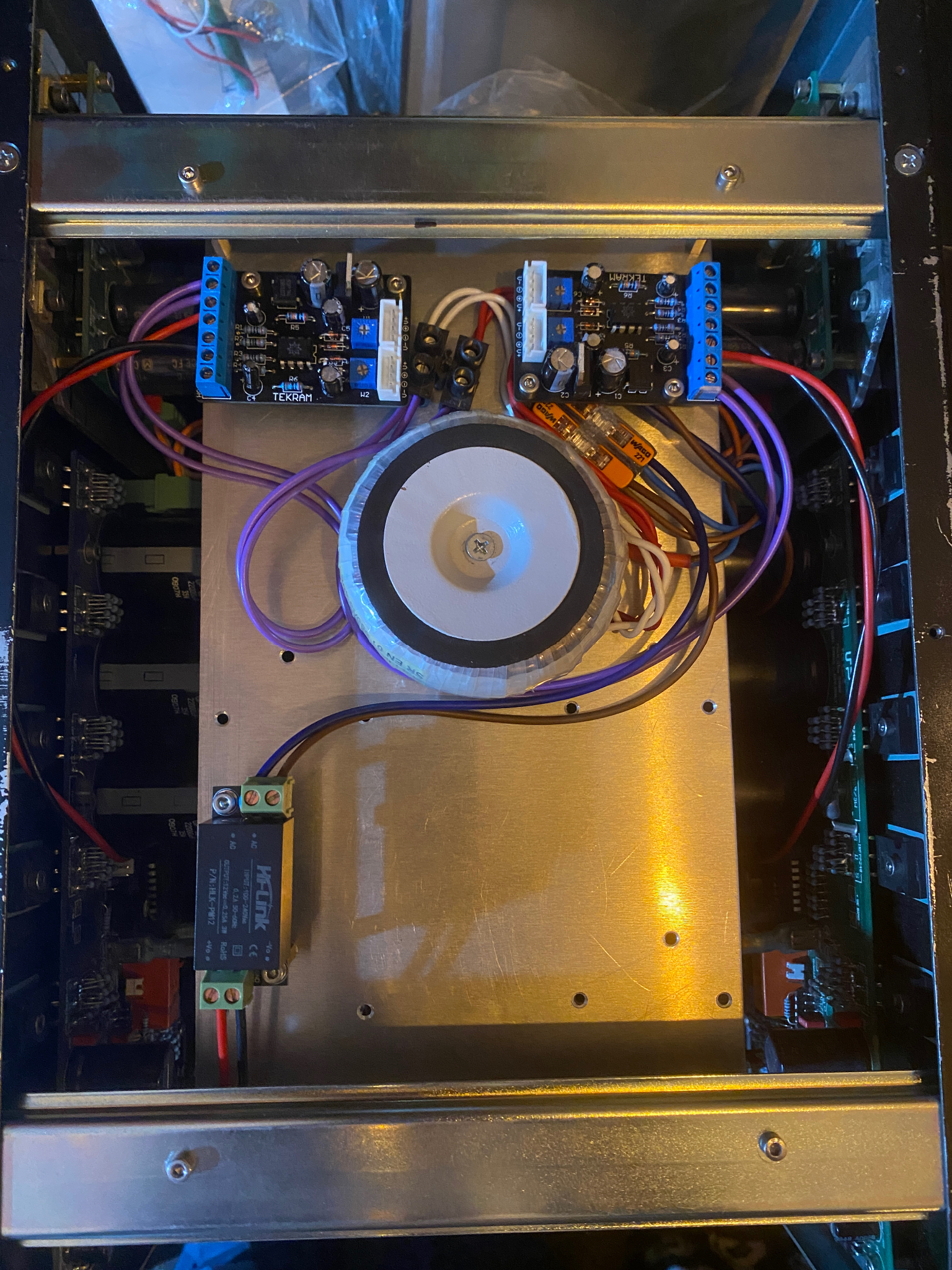 Mise en place d’une plaque alu pour supporter les cartes vumètre (2 pour rester cohérent avec l’alim, même si le 0V est commun partout). Torique 30va pour l’alimentation des deux et cartes protection Hp. Un petit transfo 12vdc pour la led façade.