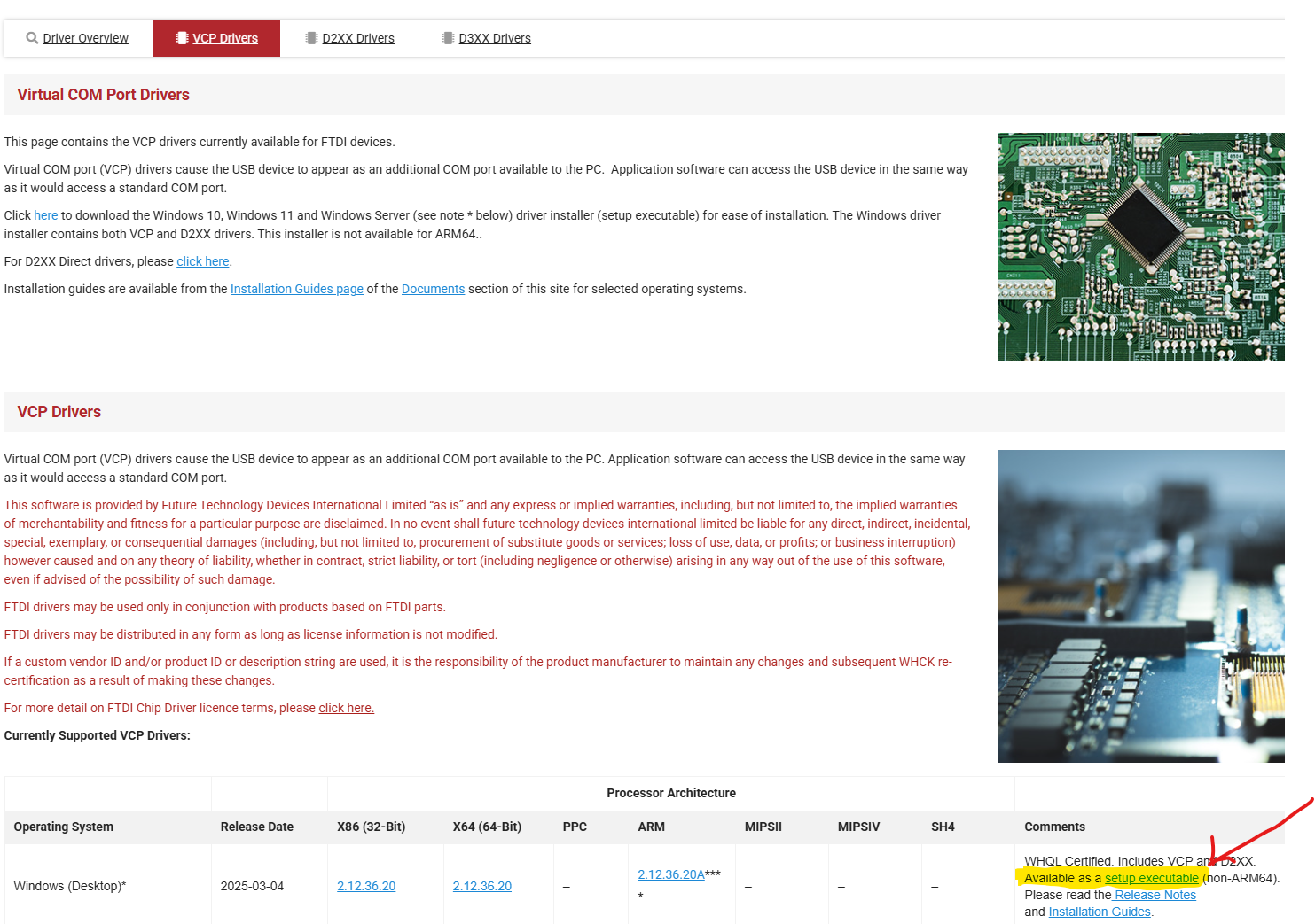 Ensuite, les drivers FTDI ne sont visiblement pas fournis par Windows11, il faut donc les installer. On les trouve sur le site FTDI, à cette page : https://ftdichip.com/drivers/vcp-drivers/