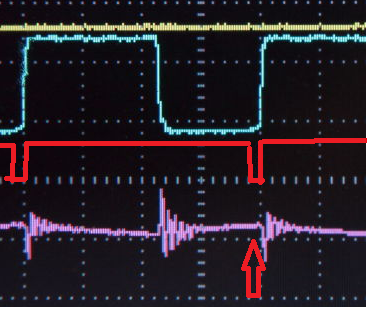 Pour ce bruit, voici le signal PWM à 100KHz. (en bleu)