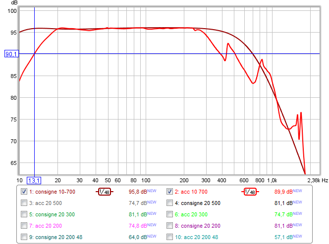 la consigne est plate à 10Hz, puis est coupée à 700Hz en LR24 (le curseur bleu indique -6dB, donc la coupure à 700Hz pour la consigne :