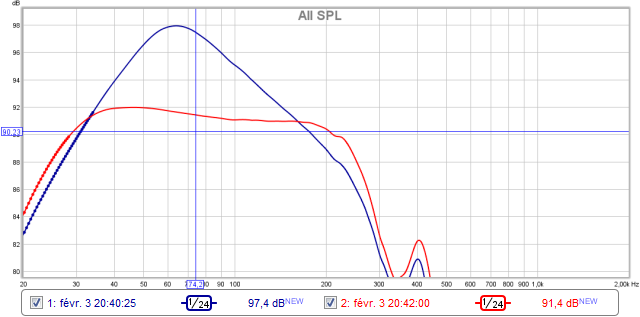 Il faudrait mettre un petit low shelf en bas vers 40Hz, pour étendre vers les 20Hz, dans les peq du crossover qui est après l'additionneur (correction dans la chaine directe).