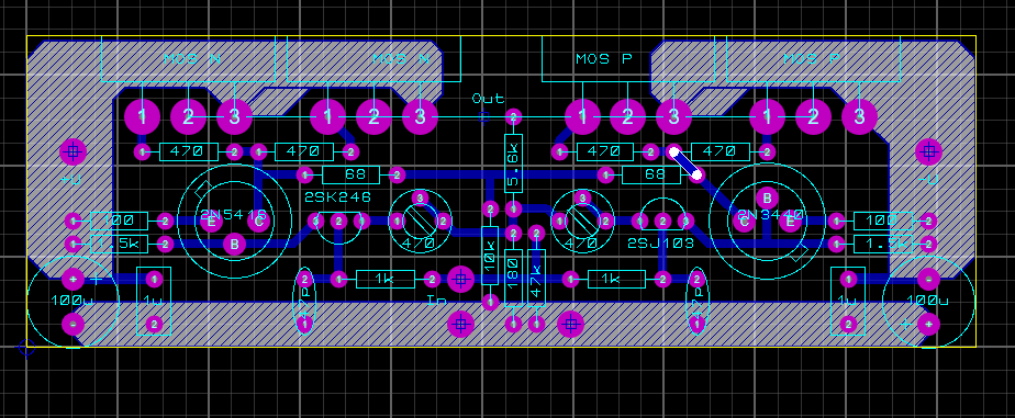 J'ai commencé les modules ampli. Niveau ampli rien de nouveau, j'ai seulement recopié le schéma de M. Plantefeve, et j'ai gardé les MOS d'origine.. désolé Androuski :-/