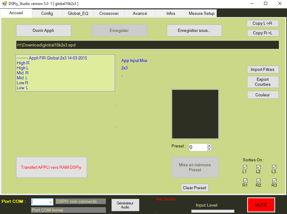 Pour le mute des sorties DSPiy, c'est en direct live quand il est connecté au PC avec les 6 cases en bas à droite dans DSPIY studio!