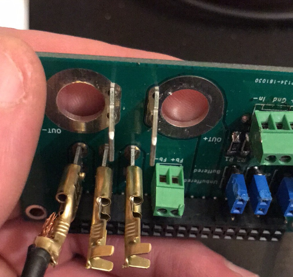 Passer la ferrite, sertir une Faston, la plugger dans V+ ampli 1.