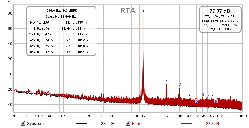 Coté gains : Hypex annonce un gain théorique de 21V/V cad 26dB. Ajouté au 6dB du That on arrive a 32dB théorique pour 32,5dB constaté. C'est cohérent.
