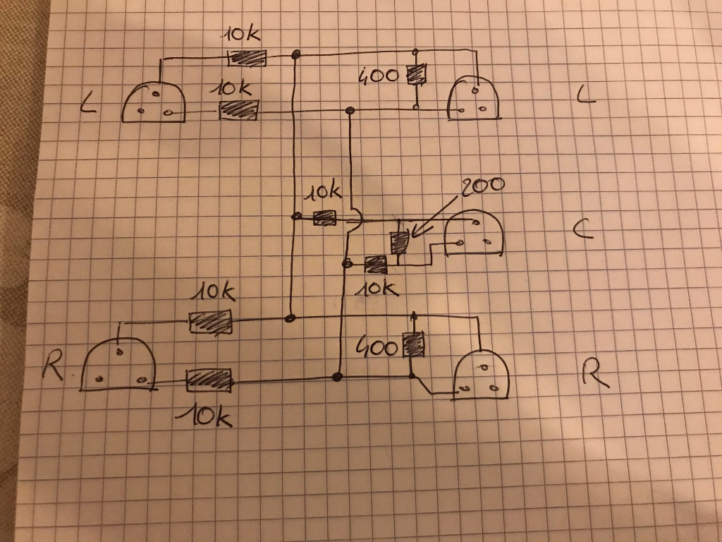 Niveau A = Niveau B => Sortie C soit enceinte L+C+R