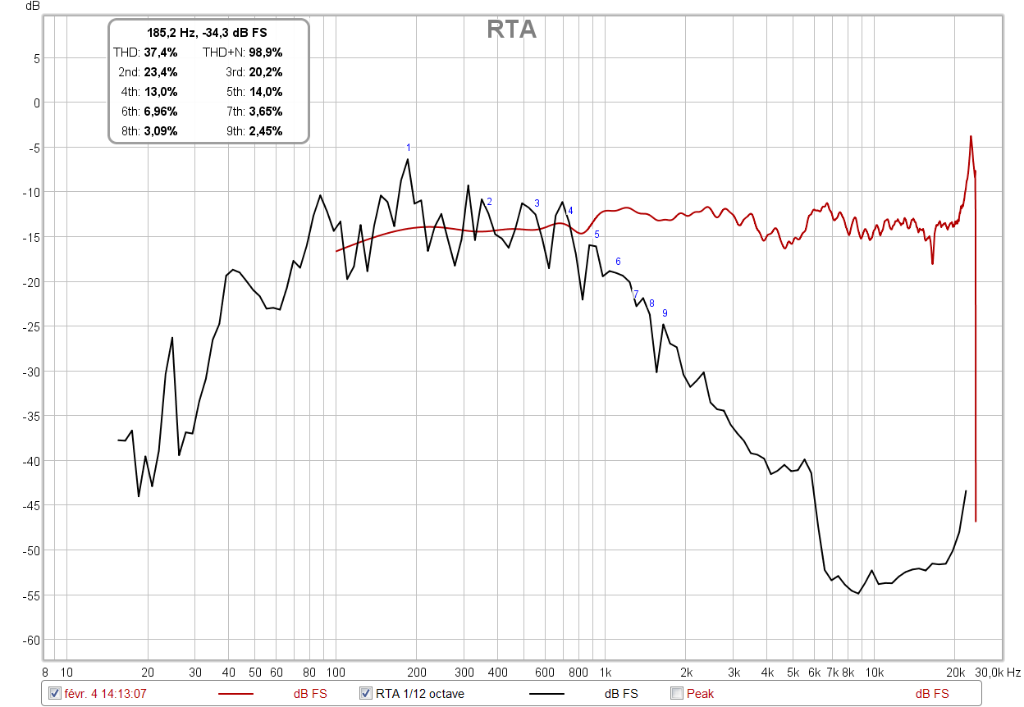 Sinon, j'ai nettement monté le volume et j'ai retenté une mesure juste pour voir, ça couine fort mais la disto a baissé d'une trentaine de dB! Voilà 2 petits screens, le midwoofer seul en RTA à 50cm toujours, en ayant un peu augmenté le volume, et la disto mêmes conditions :