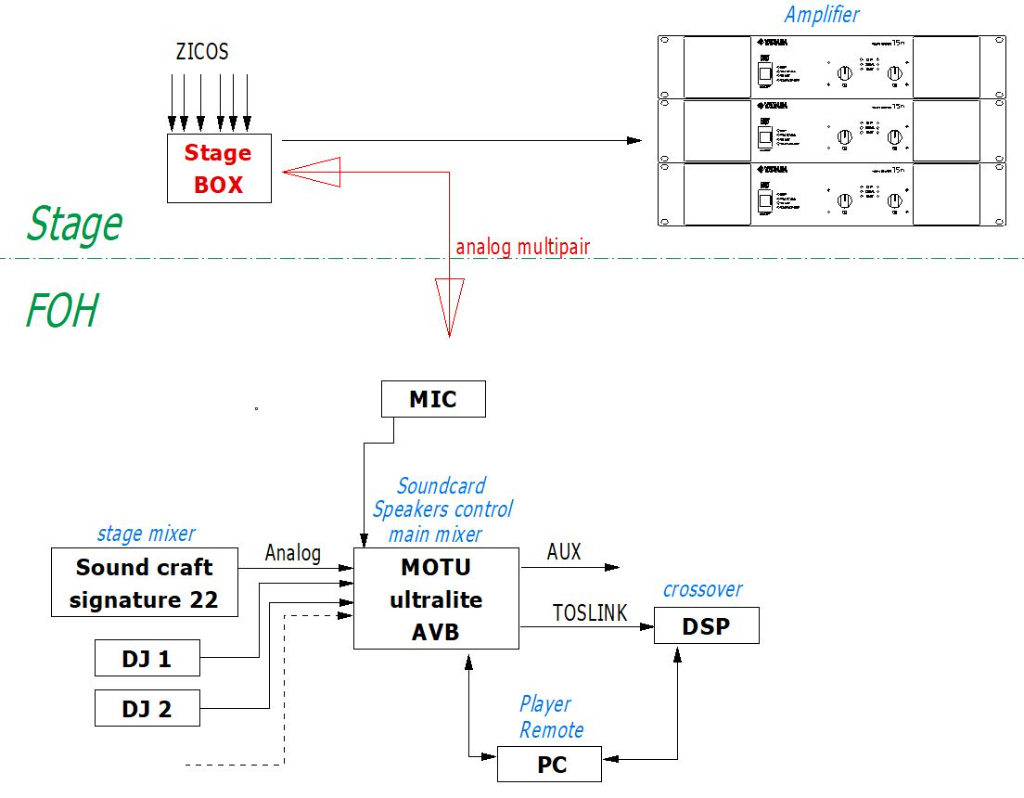 -> J'aime bien avoir la main sur le DSP côté régie. Bien que une fois le système calé normalement j'y touche plus. Je fais de l'EQ avec la motu pour sculpter/affiner le truc suivant les sources / groupes / style de musique / bonhomme.