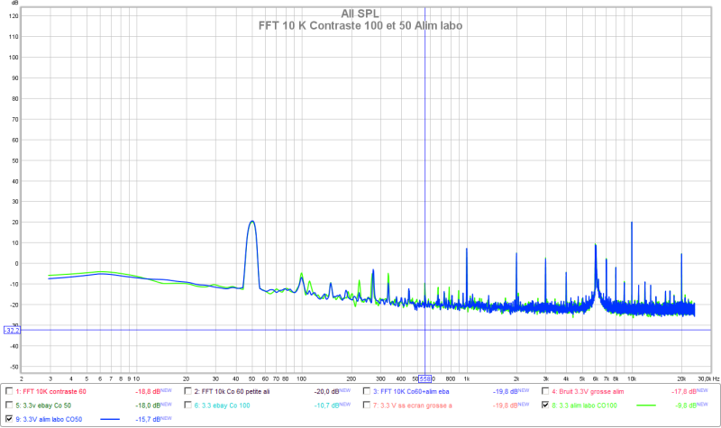 En vert mesure sur le 3.3V contraste à 100, en bleu contraste à 50