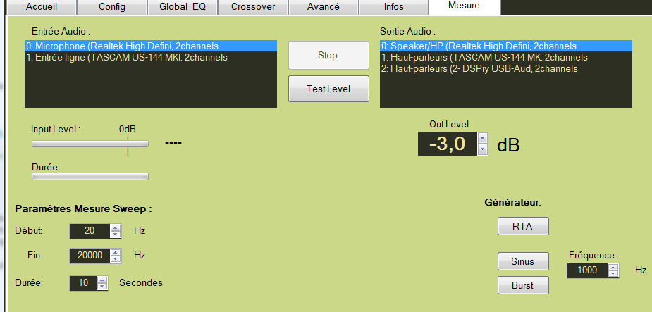 Egalement, je ne sais pas si c'est fait/prévu, mais lorsqu'on mesure un tweeter, ça serait peut-être pas mal de forcer la fréquence de départ du sweep à une certaine fréquence, pour pas abîmer le tweet. Ce pourrait être un paramètre dans l'onglet mesure car il y a de la place.