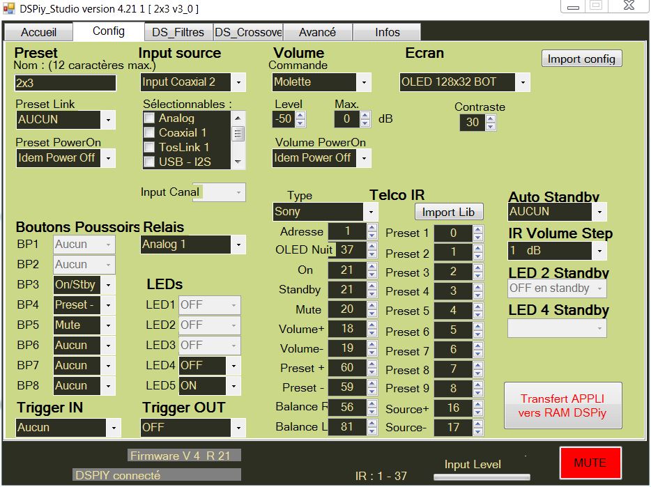 J'ai juste branché mes DA990 avec leur filtre passif. J'ai réglé le DSPiy pour qu'il ne coupe rien (10-20000Hz), c'est vrai que ça chante pas trop mal le 9023. Un peu de ronflette au début, ça venait de l'ampli, c'est un peu la fête au câble dans tous les sens pour l'instant donc... J'ai peut-être trouvé une bonne séparation en acier pour mon boitier, à voir...