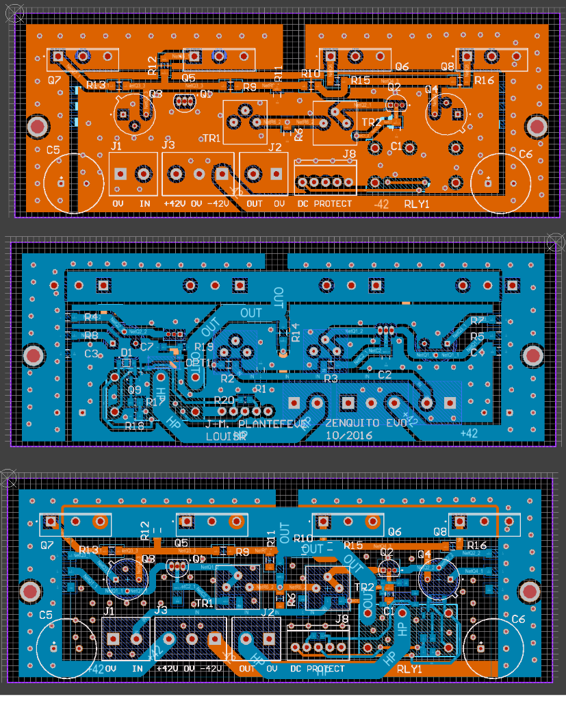 j'ai renoncé au mini zenquito parce que je suis trop limite en compétences pour la mise au pt, il s'agit d'un petit montage d'ampli composite à base de LM1875+aop. Je l'ai routé mais c'est pas moi qui fait la mise au point... et puis il n'y a aucun réglage dessus. Effectivement avec tes dimensions ça picote. Par contre là où tu aurais pu simplifier le routage c'est en optant pour des lateral mosfet double die, ça se trouve chez semelab, et du coup une simple paire de complémentaires suffit.