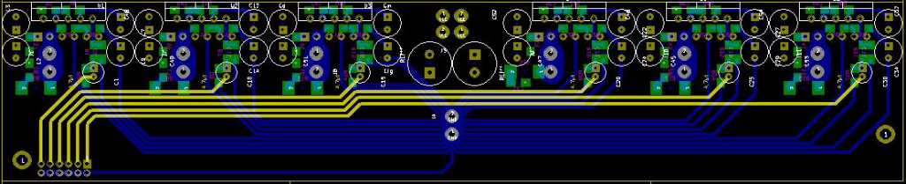 Parallèlement à mon petit système à base de LM1875, vu que j'ai deux DSPiy j'ai commencé à mettre en chantier un petit intégré 6 voies à 1 seule alim à pluguer directement carte à carte sur le DSPiy, en utilisant le connecteur 12 pôles sur pin header dispo en + du bornier. Bref j'ai des rêves d'intégration, d'ordre, de netteté, et pourquoi pas de performance. Je prévois d'utiliser 6 LM3886, avec un schéma tout ce qu'il y a d'ordinaire. La difficulté est bien entendu dans le routage des masses. J'en suis là :