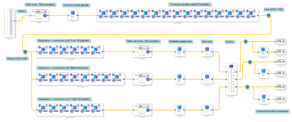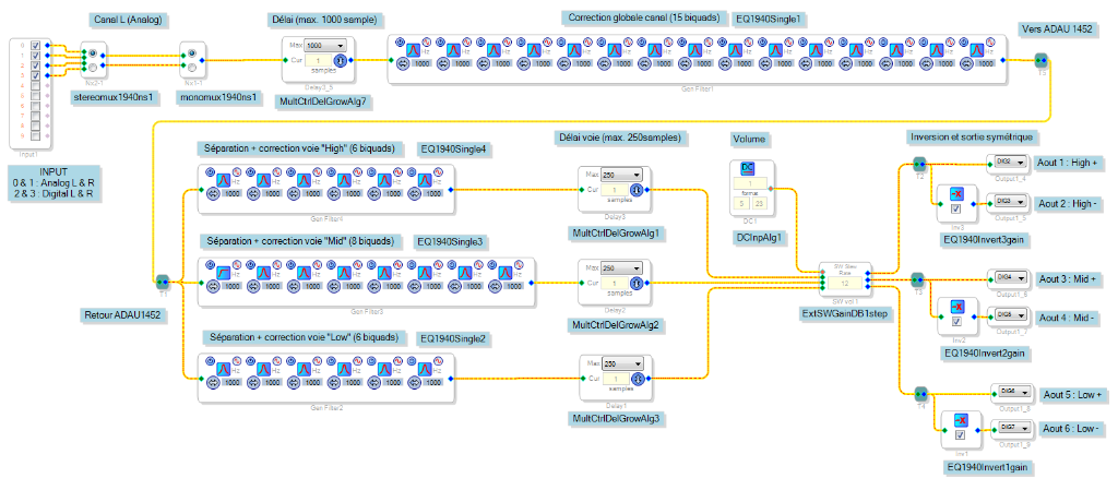 - Chaque DSPiy traitera un canal et les ressources du ADAU1701 seront exploitées comme dans l'application "1x3 pour enceinte 3 voies en IIR"