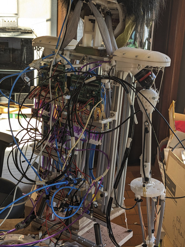 Pour cela j'ai choisi un module ESP32 avec interface I2S pour l'audio + petit ampli mono, carte SD, RS485 pour implanter du Modbus qui commandera les électrovannes des muscles pneumatiques et quelques GPIO.