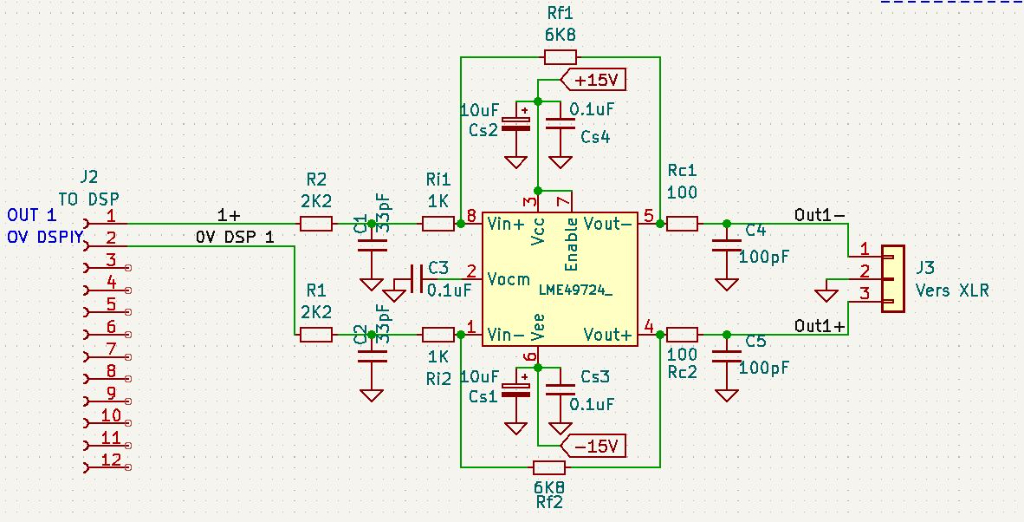 Voici le schéma de l'entrée. Attention que les valeurs des résistances ont été ajustées par la suite et que le filtre R1-C44 est nécessaire vu le câble entre DSPiy et Ampli.