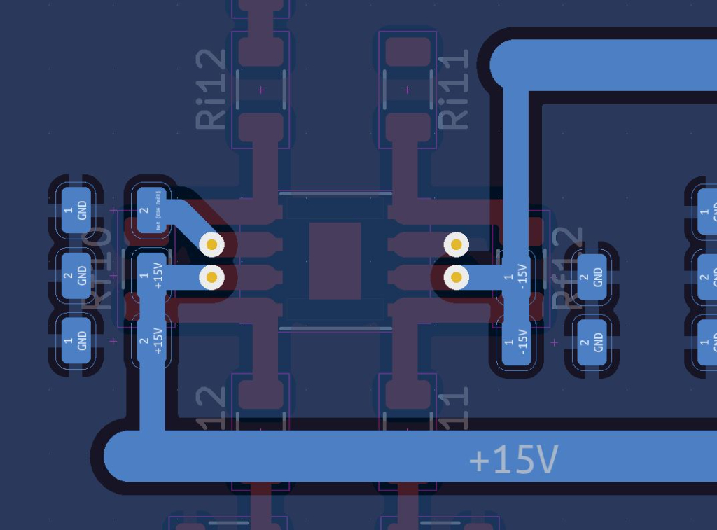 +/- 15V au verso de la carte. J'ai eu un soucis à cause des "ilots" créés dans le plans de masse. J'ai donc ajouté des via 1mm/0.4 pour repiquer le deuxième plan de masse.