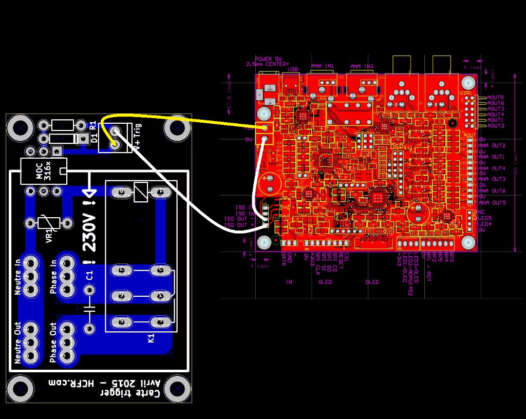 On peut également mettre V+ de la carte à ISO Out si l'opto du DSPiy est utilisé pour commuter V+, dans ce cas trig. va directement au Ov du DSPiy. J'espère ne pas avoir dit d'ânerie.