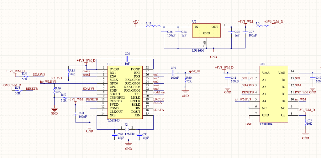Par contre, R55 et R54 prennent le +3V3_WM qui est en fait l’alim de la PLL. C’est pas bien grave mais l’I2C est polluant.