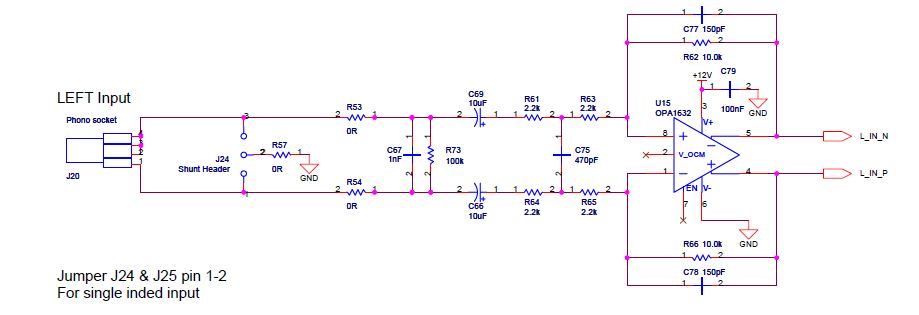 OPA1632 est un grand classique pour faire du différentiel et de plus il est particulièrement bon en SNR et thd. Ce schéma correspond a ceux décrits dans la datasheet pour les deux modes sym et asym, et le jumper permet de passer de l'un a l'autre mode. Il y a des réseau supplémentaires de filtrage (C67 - R73) et autour de C75 en entrée : sais pas si c'est utile dans notre cas.