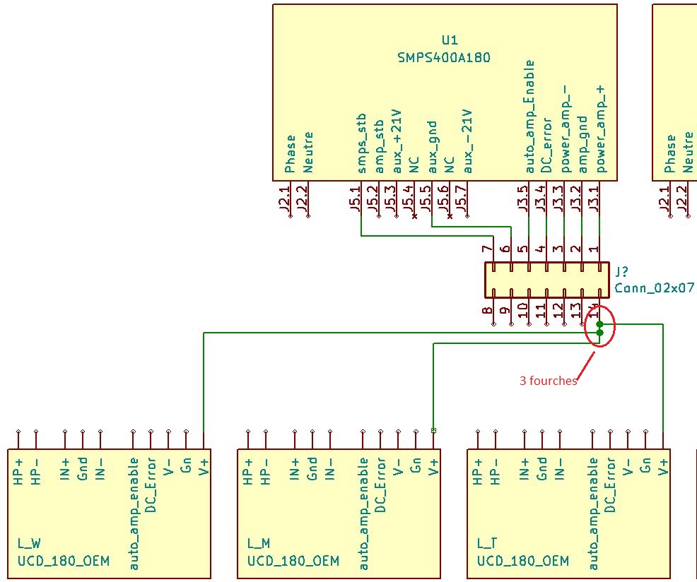Très étrange le choix des couleurs, il serait plus logique d'avoir un V+= couleur V- une autre ... et commun pour tous les amplis.