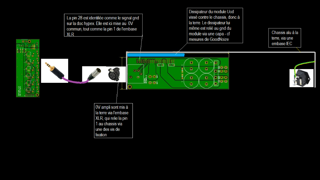 tu veux dire mets le 0V de cet ampli au chassis, lui même à la terreL'embase XLR en entrée met pin 1 donc le 0V à la terre.