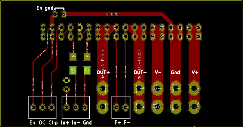 Pour le blindage/isolation entre les piste avec plan de masse gnd : j'ai envie de distinguer électriquement le "input Gnd" du pin 28 et le "power supply ground" des pins 5/6/7/8, de façon a garder un micro plan de masse pour le premier mais à faire un plan de masse intégral avec le second, qui ferait office de blindage entre les pistes sensibles comme celles que tu as pointées. Deux plans séparés quoi, sachant qu'ils sont connectés de toutes façons sur la carte ampli elle même, comme tu me l'avais précisé.