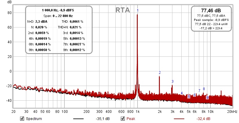 Ne pas tenir compte de mes mesures de distos : la carte son sature complètement avec 1Vrms. J'obtiens 1Vrms avec -3,55dBFS au géné. Pour rester dans le vert je descend à -12,55dBFS au géné REW.