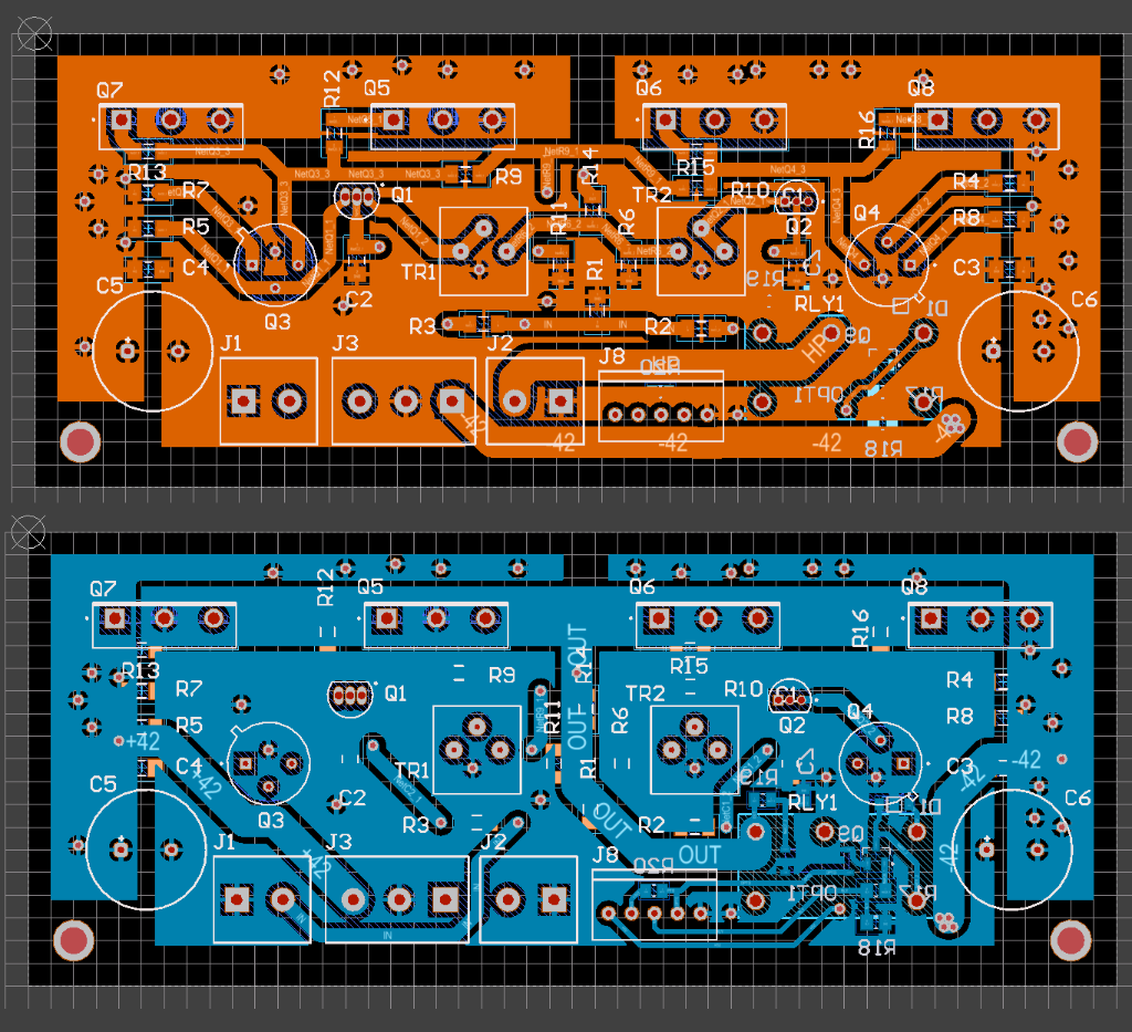 edit : pour les pads de fixation, j'y avais pensé cette fois, il n'y en a pas sur le pcb d'origine. J'en ai finalement rajouté à l'avant car il y a le relais et les connecteurs en plus, je veux pas que ça soit entièrement supporté par les vis des transistors